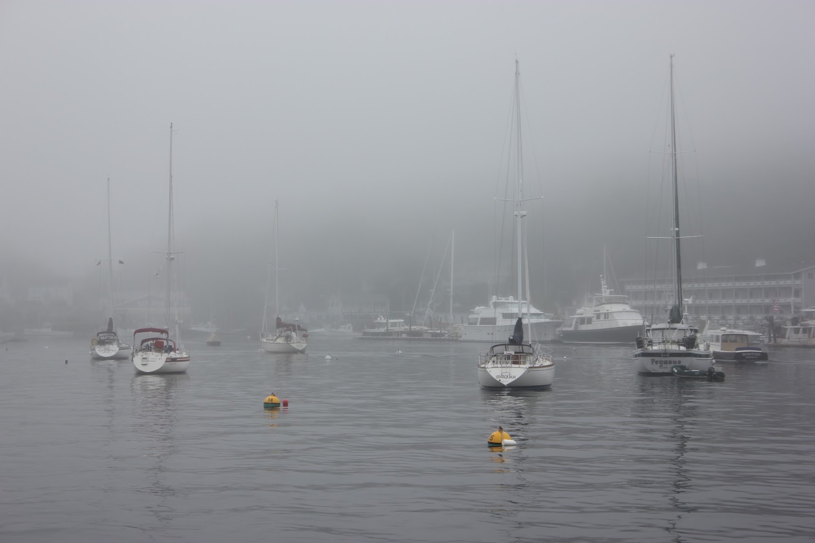 Hmm, I now know how to drive a man insane!  Put him on a boat, set him on a mooring with a generator that is smoking, in the middle of fog that at times is so dense its hard to see the boats next to you, than teases you by pulling back to display a little bit of sunshine, than close back in again just as you think you might escape. FOR THREE DAYS!